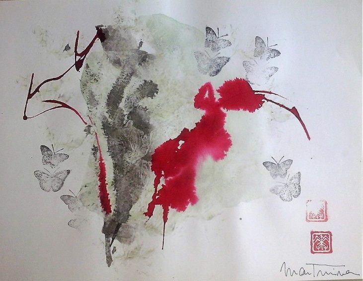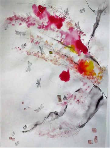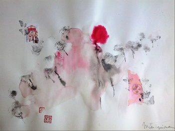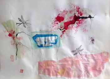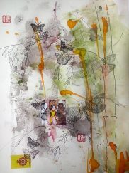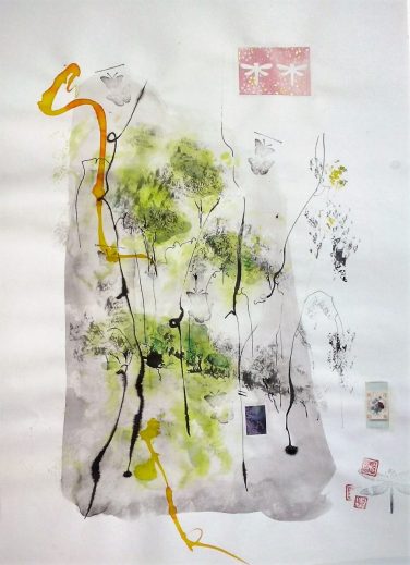 Obras realizadas en técnica mixta: aguadas, tintas y collage sobre papel japonés.